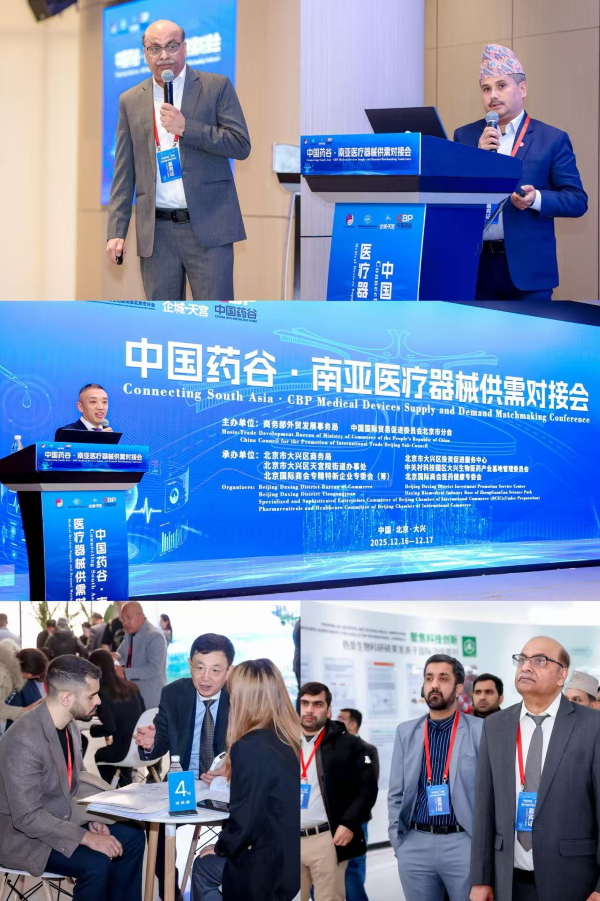 12月16日-17日,由商务部外贸发展事务局与北京市贸促会共同主办,大兴区商务局、大兴区投资促进服务中心、大兴区天宫院街道办事处、中关村科技园区大兴生物医药产业基地管理委员会、北京国际商会专精特新企业专委会(筹)、北京国际商会医药健康专委会承办的“中国·药谷—南亚医疗器械供需对接会”在北京大兴成功举办。商务部外贸发展事务局副局长王德阳,北京市贸促会党组书记、北京国际商会会长章建伟,大兴区区委常委、常务副区长郭文杰出席会议并致辞。政协北京市大兴区委员会党组书记、主席禹学垠,北京市贸促会副主任、北京国际商会副会长兼秘书长朱家亮,尼泊尔化学与医疗供应商协会会长马克塔·巴哈杜尔·哈马尔,马来西亚一带一路总商会北京区经济主任程伟文、上海合作组织国家多功能经贸平台卫生可持续发展工作委员会秘书长杜江春及印度使馆商务代表等领导出席会议。来自巴基斯坦、孟加拉国、尼泊尔、印度等6个南亚国家30家企业组成的医疗器械采购团、北京近百家企业、国际商协会代表等200余人参会。会议期间共达成15个合作项目,现场签约采购金额1425万美金。
